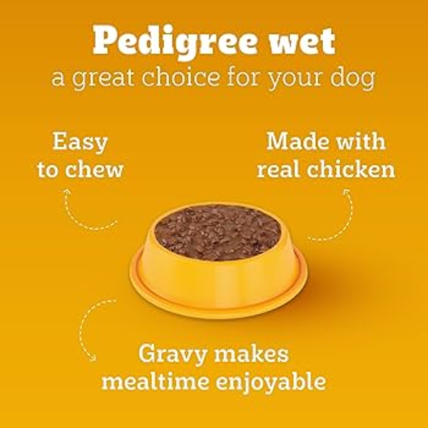 - Delicious Flavour: Pedigree Adult Wet Dog Food, Chicken & Liver Chunks in Gravy, is made with real meat, high quality protein and contains a gravylicious flavour.